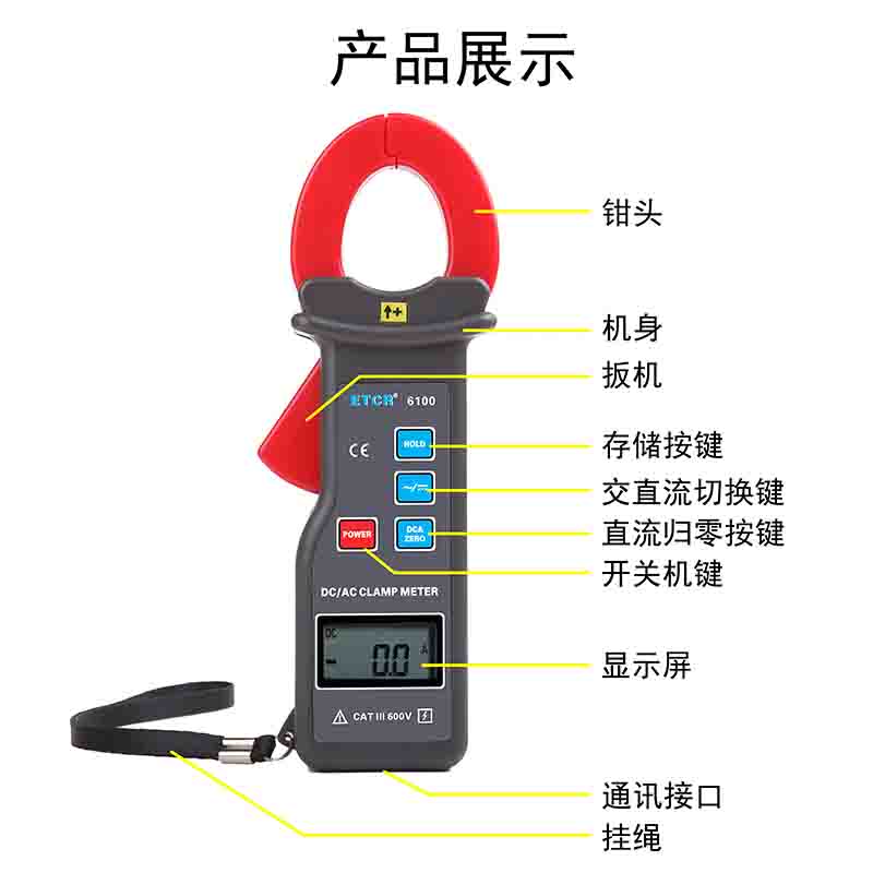 ETCR6100直流/交流鉗形電流表又名鉗形電流表,用于直流、交流電流測量,鉗表采用霍爾感應及數字集成技術,鉗頭無任何裸露金屬導體,非接觸測量,確保操作安全。廣泛適用于電力、通信、氣象、鐵路、油田、建筑、計量、科研教學單位、工礦企業等領域,是電工安全檢測的必備工具。