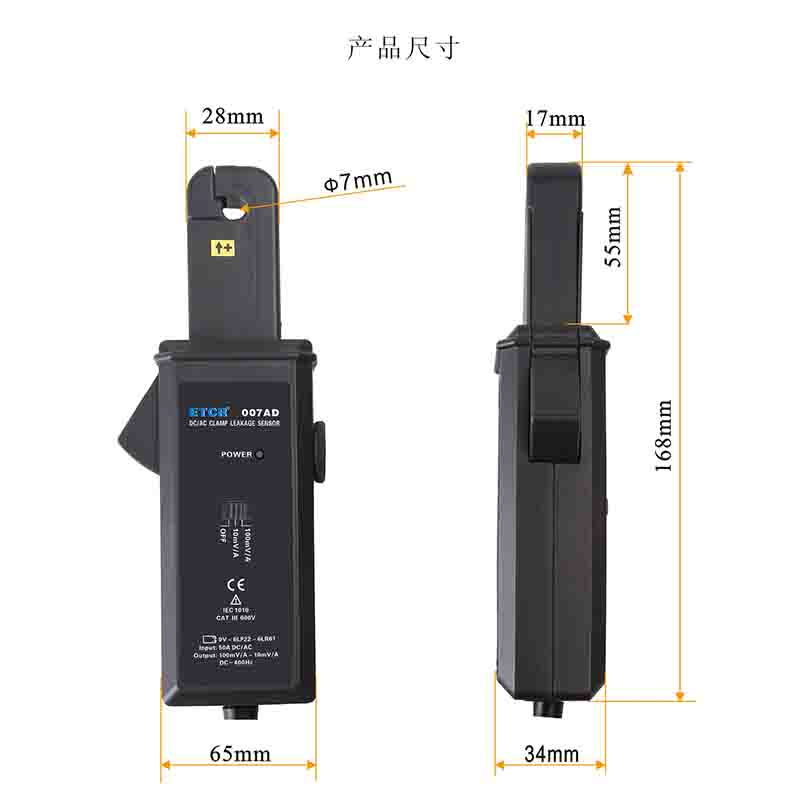 ETCR007AD | ![]() | 量程: 0mA~50A AC/DC 精度等級(jí):3 相位誤差:≤3° 工作頻率:DC~400Hz | 10mV/1A或100mV/1A(手動(dòng)換擋) | Ф7mm | 168mm×65mm×34mm | 170g |