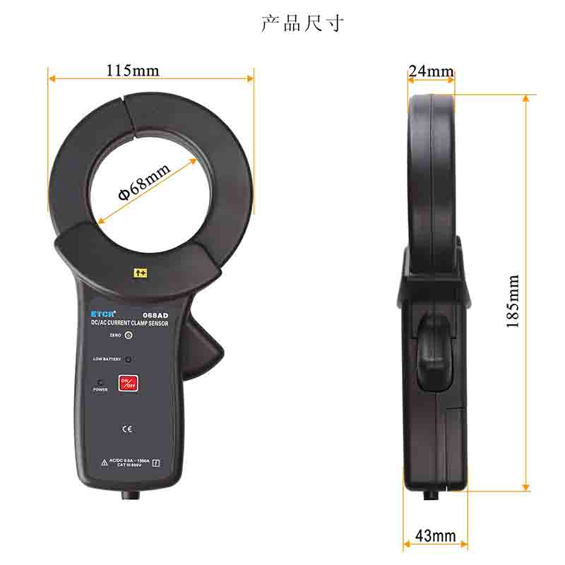 ETCR068AD | ![]() | 量程: 0.0A~1500A AC/DC 精度等級(jí):3 相位誤差:≤3° 工作頻率:DC~400Hz | 1mV/1A | Ф68mm | 224mm×115mm×43mm | 515g |
