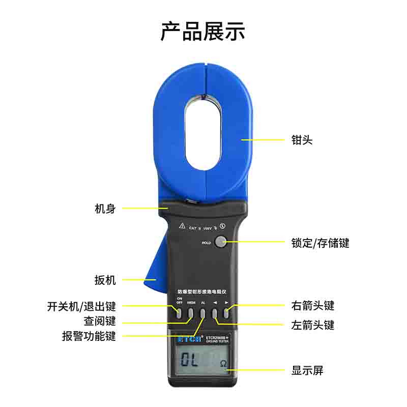 ETCR2000B+防爆型鉗形接地電阻儀又稱防爆型接地電阻表、防爆型鉗形接地電阻測(cè)試儀,用于接地電阻、回路電阻測(cè)量、接地故障判斷。在測(cè)量有回路的接地系統(tǒng)時(shí),不需斷開(kāi)接地引下線,不需輔助接地極,安全快速、使用簡(jiǎn)便。鉗形接地電阻儀廣泛應(yīng)用于電力、電信、氣象、油田、建筑及工業(yè)電氣設(shè)備等的接地電阻測(cè)量、回路電阻測(cè)量。長(zhǎng)鉗口特別適宜于扁鋼接地的場(chǎng)所。
