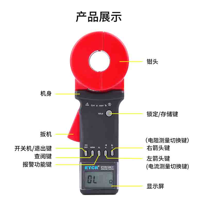 ETCR2100C+鉗形接地電阻儀又稱鉗形接地電阻表、接地電阻儀、回路電阻測試儀、單鉗接地電阻測試儀、環路電阻測試儀,用于接地電阻、回路電阻測量、接地電流測量、接地故障判斷。在測量有回路的接地系統時,不需斷開接地引下線,不需輔助接地極,安全快速、使用簡便。鉗形接地電阻儀廣泛應用于電力、電信、氣象、油田、建筑及工業電氣設備等的接地電阻測量、回路電阻測量。