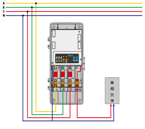 5、具有自動旁路功能,當輸入相的熔斷器熔斷,換相器將停止換相,并自動將負載切換到有電相,保持用戶供電,更換熔斷器后,換相裝置即可恢復正常運行。