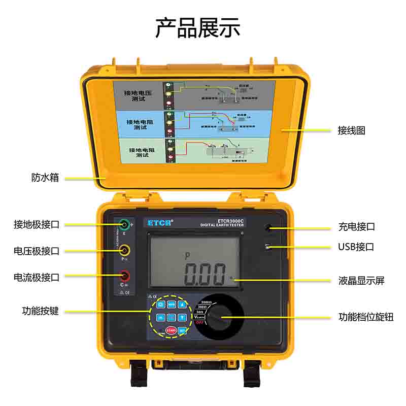 ETCR3000C數字式接地電阻測試儀由主機、監控軟件、測試線、通訊線等組成。儀表外殼采用防水保護箱,防撞、防摔、防水(防護等級IP65)堅固安全耐用,儀表還配有大容量可充電鋰電池組,特別適合在戶外工地使用。主機超大LCD顯示,白屏背光,棒圖指示,一目了然。同時能存儲400組數據,通過監控軟件實現歷史查詢與在線實時監控功能,動態顯示,具有最大、最小、平均值指示,具有報警值設定及報警指示功能,具有歷史數據讀取、查閱、保存、報表、打印等功能。