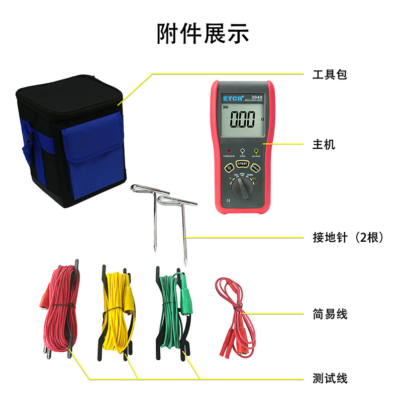 ETCR3040數字式接地電阻測試儀由主機、測試線等組成。具有自動關機功能、儀表全量程自動換擋、抗干擾能力強、操作更簡易。其廣泛應用于電力、電信、氣象、油田、建筑、防雷及工業電氣設備等的接地電阻測量。