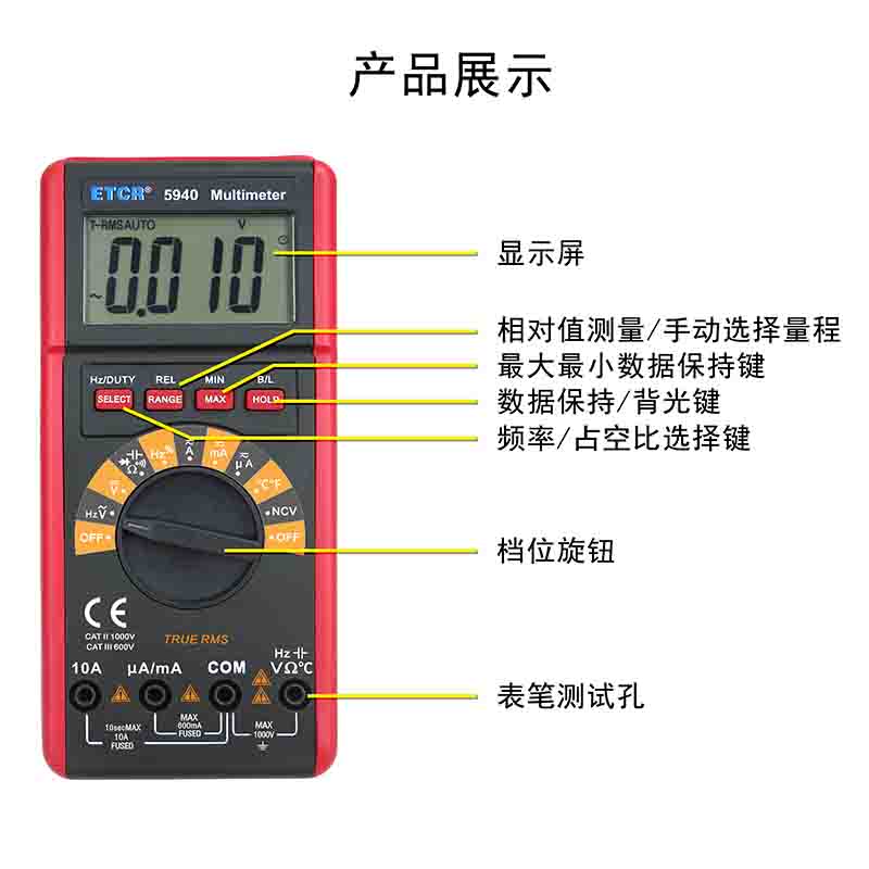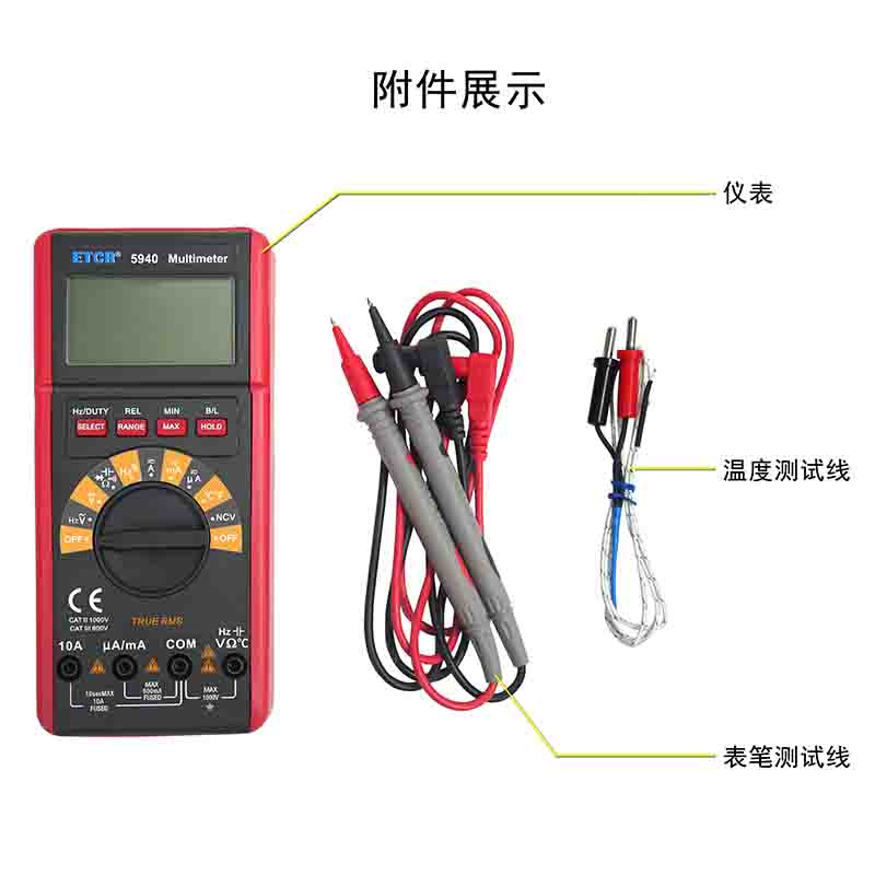 ETCR5940數(shù)字萬用表 | DC 0mV~1000V AC 0mV~1000V | DC 0.0uA~10A AC 0.0uA~10A | 0.0Ω~60MΩ | 0.0nF~9.999mF | 0.0Hz~20MHz | 0℃~1000℃ | |