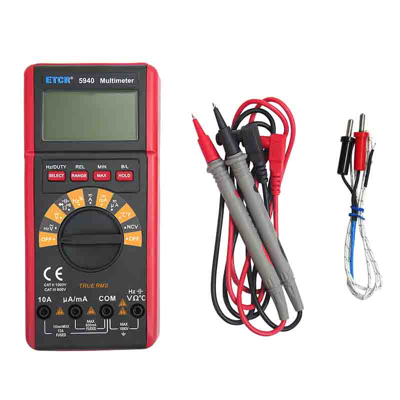 ETCR5940數(shù)字萬用表又稱數(shù)字萬能表、智能萬用表,是一款3 5/6位便攜式自動量程數(shù)字多用表,可測量交流電壓真有效值(TRMS)、直流電壓、交流電流真有效值(TRMS)、直流電流、電阻、頻率、溫度、電容、通斷測試、二極管正向壓降等。該儀表結(jié)構(gòu)精巧、操作容易、攜帶方便,是電工電子測量之理想工具。