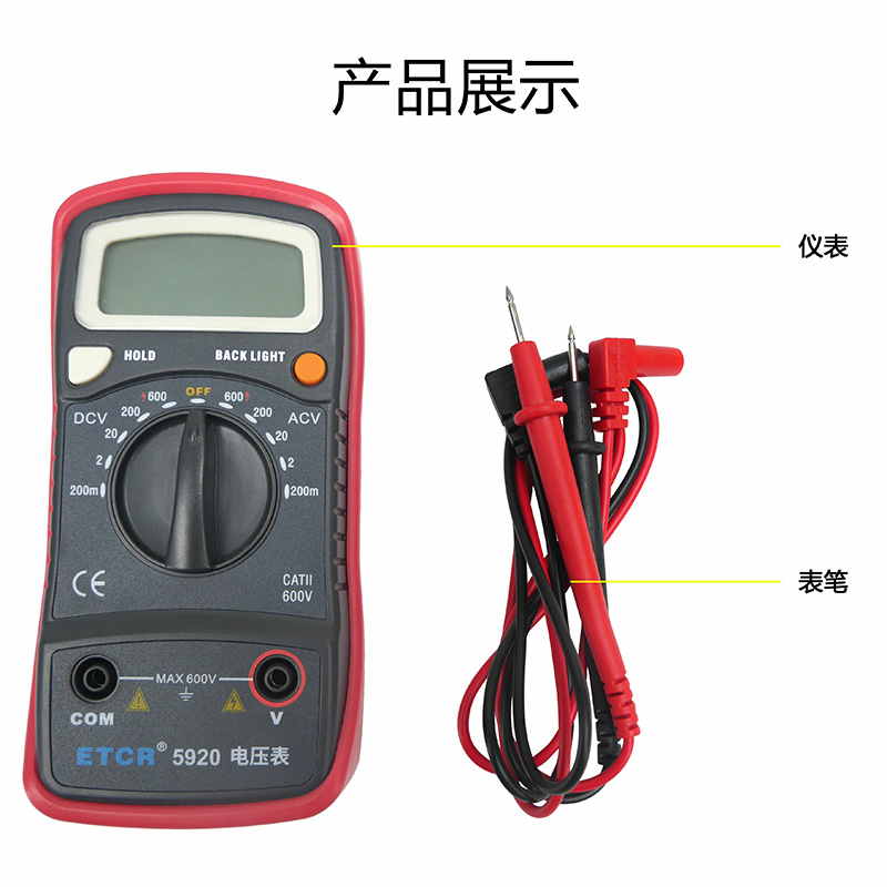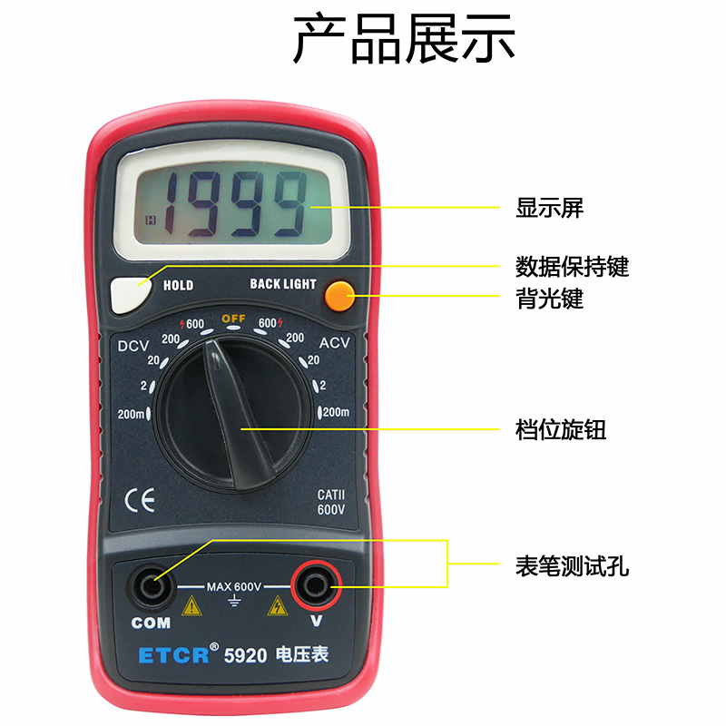 ETCR5920數字電壓表設有背光源,方便用戶在黑暗的場所讀出測量值。
