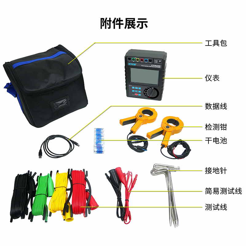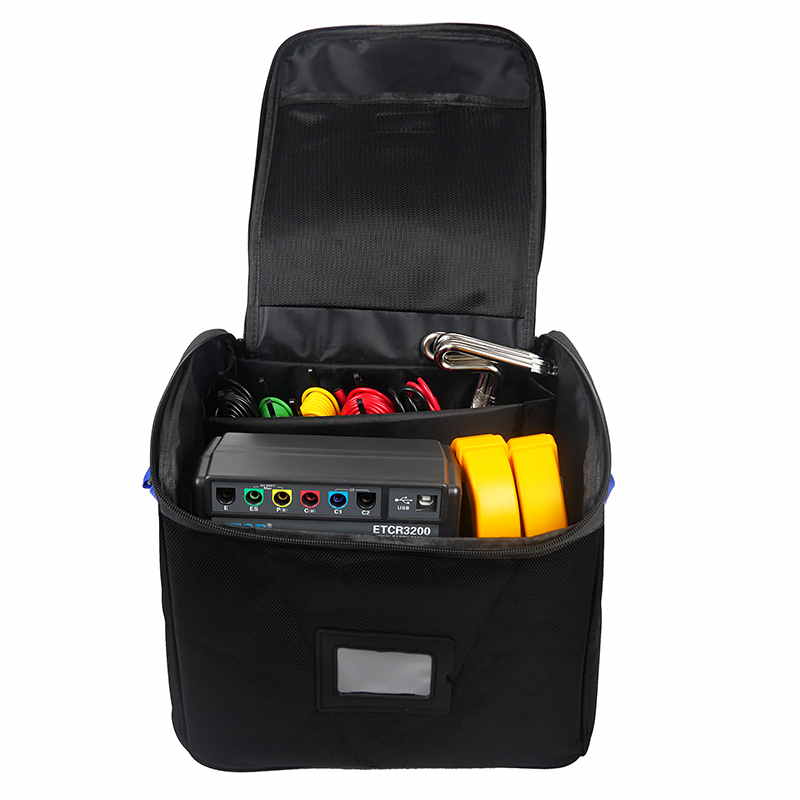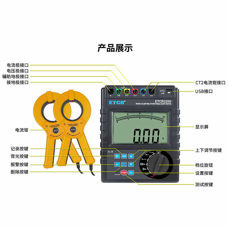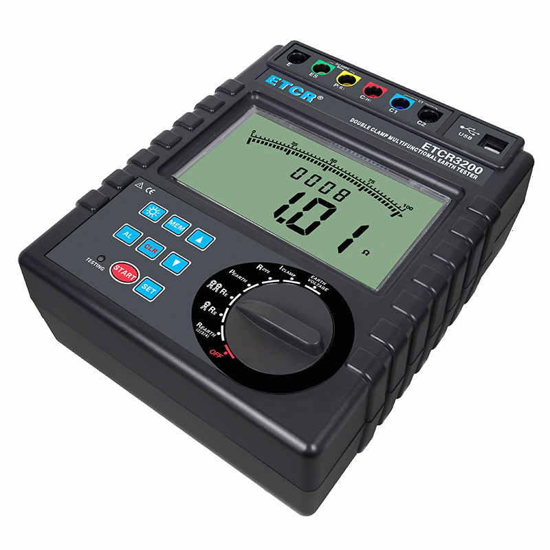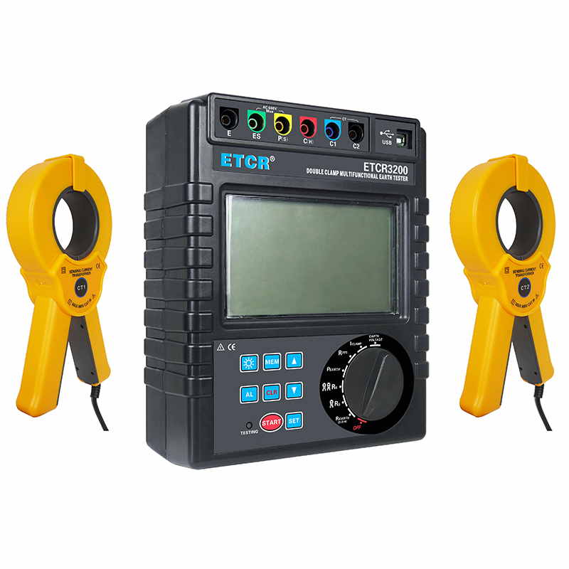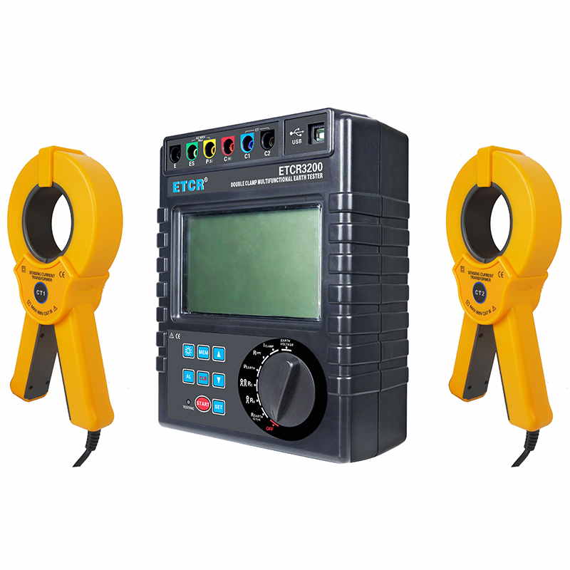 ETCR3200雙鉗接地電阻測試儀,由主機、電流鉗(雙鉗)、數據軟件、測試線、輔助接地棒、通訊線等組成。主機超大LCD顯示,具有背光、棒圖指示,一目了然。同時能存儲2000組數據,通過USB接口數據軟件可以實現歷史數據讀取、查閱、保存、報表、打印等功能。