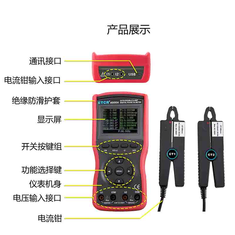 ETCR4020大口徑雙鉗數字相位伏安表 | Φ40mm | 0~360° | 0.00V~600V | 0.0mA~20.0A | 0.0W~360kW |