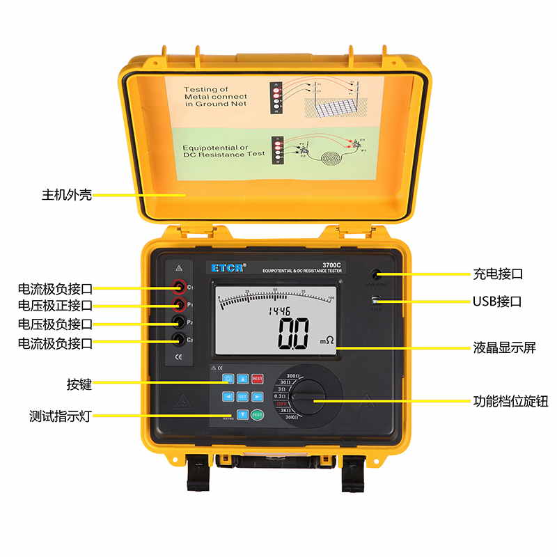 ETCR3700C等電位聯(lián)結電阻測試儀又稱直流低電阻測試儀,用于檢測建筑物中(避雷帶、地梁、構造、保護、樓板筋、水管、散熱器、衛(wèi)生間、門窗、陽臺、廚房等對象)的金屬構件之間等電位聯(lián)結電阻,也可以測量斷路器、開關、插座觸點的接觸電阻以及各種線圈電阻、分流器電阻、車船飛機的金屬鉚接電阻、電焊接點的電阻、蓄電池并聯(lián)連接電阻、配電盤母線及導線接點電阻等。儀表配有大容量可充電鋰電池組,特別適合在戶外工地使用。廣泛應用于建筑質檢站、監(jiān)理公司、建筑施工單位、防雷公司、電力部門、船舶機車廠等。