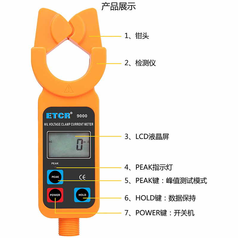 ETCR9000高低壓鉗形電流表鉗頭與引導區創新的一體化設計,通過按壓或退拔絕緣桿能快速方便鉗夾或撤離被測導線,安全快捷。儀表還具有峰值保持、數據保持、數據存儲等功能。