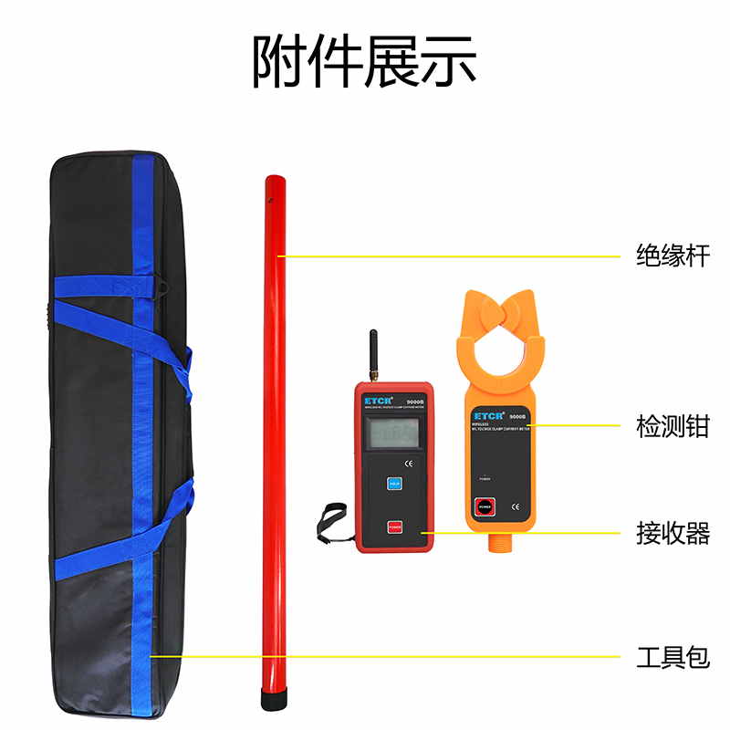 ETCR9000B無線高低壓鉗形電流表由鉗頭、接收器、絕緣桿組成,鉗頭與接收器無線通訊距離30m。鉗頭與引導區創新的一體化設計,通過按壓或退拔絕緣桿能快速方便鉗夾或撤離被測導線,安全快捷。儀表還具有數據保持、數據存儲等功能。