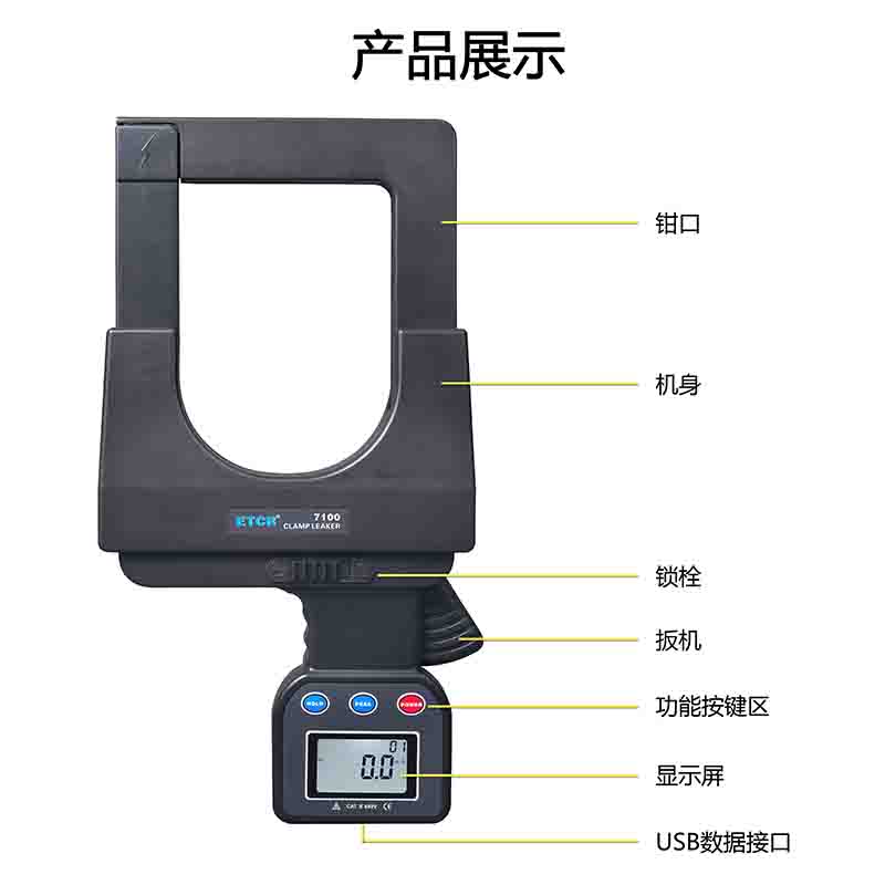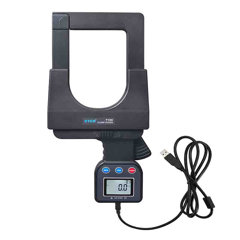ETCR7100超大口徑鉗形漏電電流表具有峰值保持、數據保持、數據存儲等功能。具有USB通訊功能,通過USB接口及上位機軟件可以在PC端在線實時監測,動態顯示最大、最小、平均值,具有報警值設定及報警指示功能,具有歷史數據讀取、保存、分析等功能。