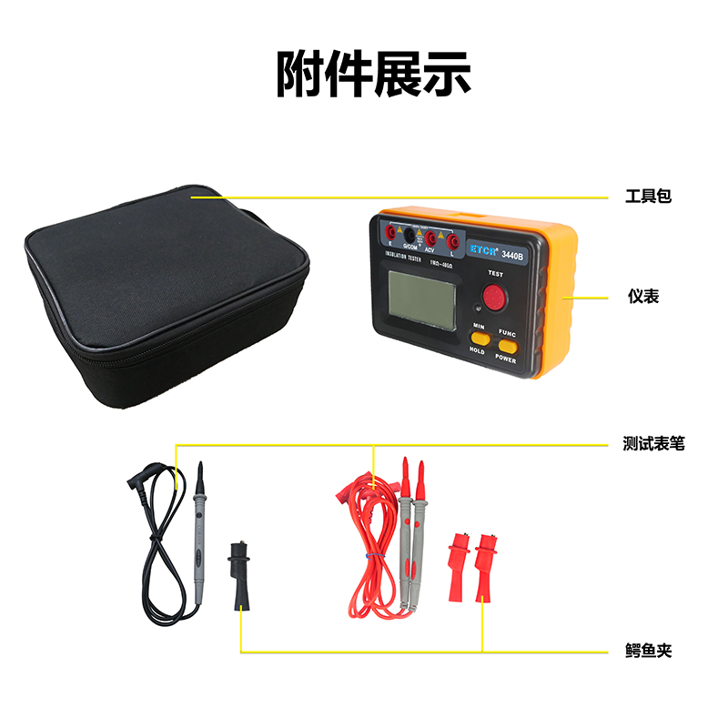 ETCR3440B絕緣電阻表 | 500V、1000V | 0.5MΩ~40GΩ | 1mA MAX | AC:0V~600V | |