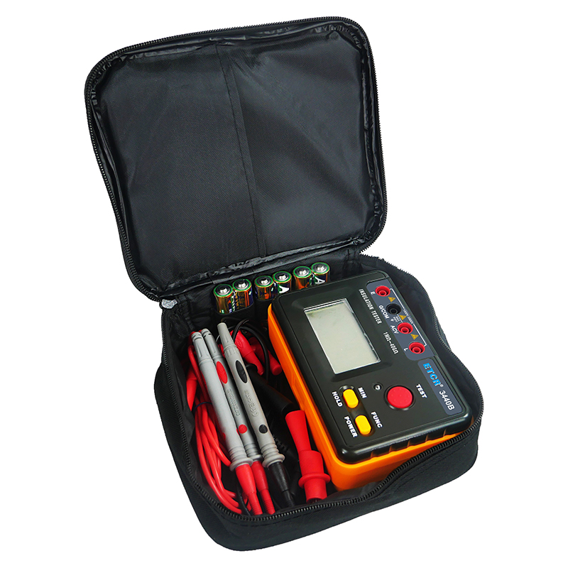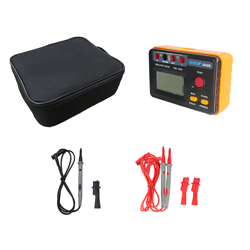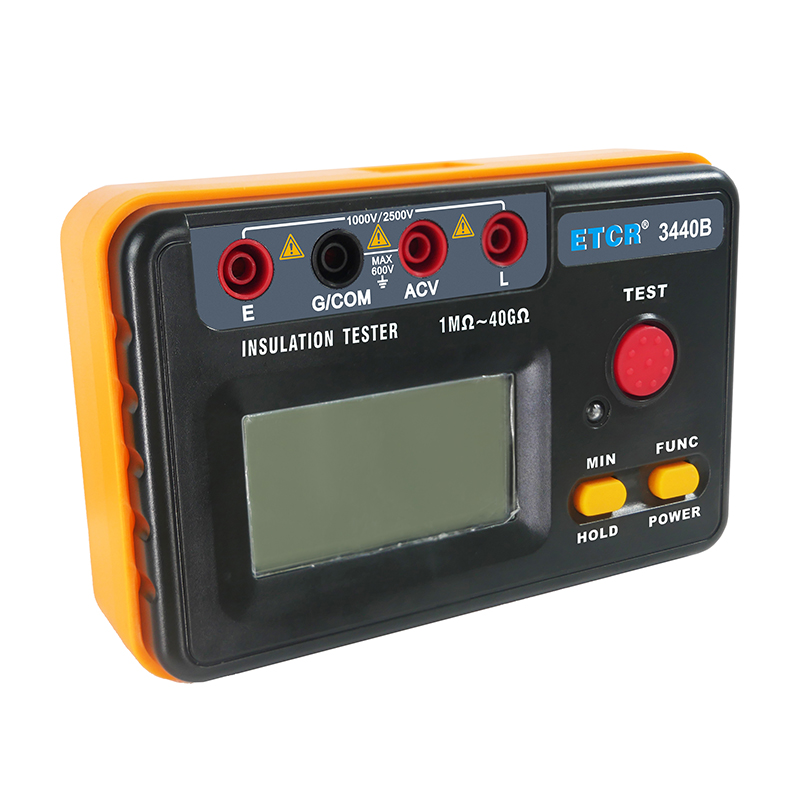 ETCR3440A絕緣電阻表是一款數字式絕緣電阻測試儀。其準確度高、操作簡單可靠、使用方便。根據不同機型,輸出測試電壓500V/1000V可切換。普通絕緣電阻表不能測量自身輸出的高壓,在絕緣電阻表輸出高壓不符合額定值時,用戶不容易發現,以至有時測量結果偏差過大,造成安全隱患,它可適時監測輸出高壓,用戶在任何時候都能觀察到儀表實際輸出的測量電壓,有效避免因輸出電壓不符合額定值要求而造成的誤判。儀表測量范圍最高可達到40GΩ,可根據需要設置測量時間,測量完畢后或在測量中按任一按鍵都會自動保持測量結果。本產品適用于測量變壓器、電機、電纜、開關、電器等各種電氣設備及絕緣材料的絕緣電阻,對各種電氣設備進行保養維修、試驗及檢定。它結構精巧,攜帶方便,是您理想的電工、電子測試儀表。
