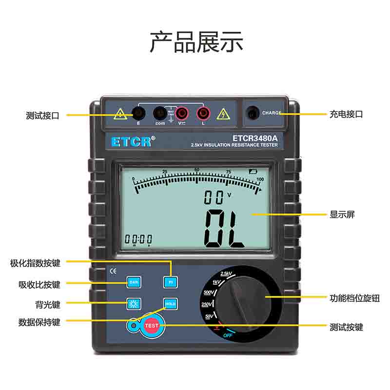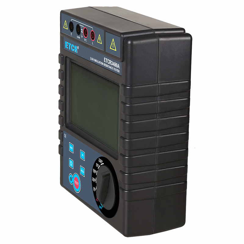 ETCR3480A絕緣電阻表又名兆歐表、絕緣電阻測試儀,用于絕緣電阻測試、吸收比、極化指數測試、交直流電壓測試。儀表具有LCD大屏幕帶背光顯示、數據保持、自動放電、自動關機等功能。儀表具有測試計時,電壓監測功能,回路電壓大于36V時,儀表將禁止測試以保護被測物及人員安全。儀表功能操作簡易,絕緣電阻值,測試時間,輸出電壓同屏顯示,具備交流電壓、直流電壓測試功能。