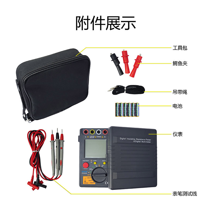 隨機附件 | 儀表:1件;高壓測試表筆:2條紅色; 表筆測試線:1條黑色;鱷魚夾:3個(紅色2個/黑色1個); LR6電池:6節;工具包:1件 |