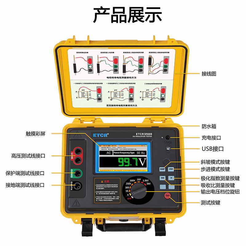ETCR3500高壓絕緣電阻測試儀又稱高壓兆歐表、高壓絕緣電阻表,擁有完善的各種絕緣電阻指標測試功能、自設測試電壓功能、良好的抗干擾能力,在變電站等有強感應電環境下、以及在分布電容較大的使用場景下具有明顯優勢。儀表采用真彩觸摸屏,所有測試數據及電池電量同屏顯示一目了然,旋鈕開關和按鍵組合使得操作非常簡單。用戶無需費力記憶操作方法,點擊屏幕的“HELP”即可彈出操作方法,有效指引用戶操作儀表。產品適用于大容量、高壓、強感應電環境下電氣設備、輸電線路等大型設備的絕緣電阻測試。是電力、電信、氣象、機房、油田、機電安裝和維修以及工礦企業供電部門常用而必不可少的儀表。