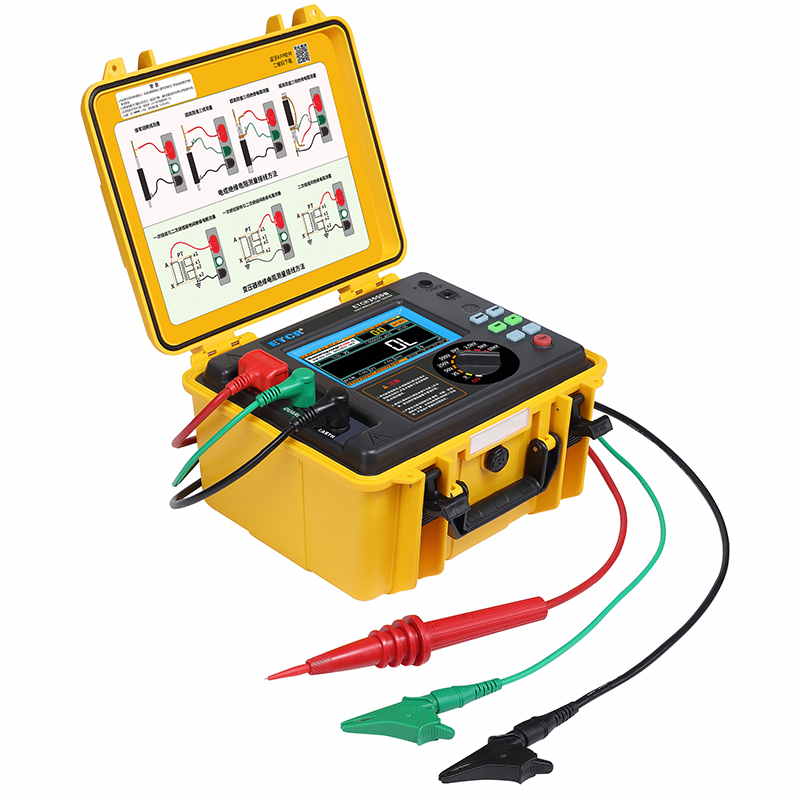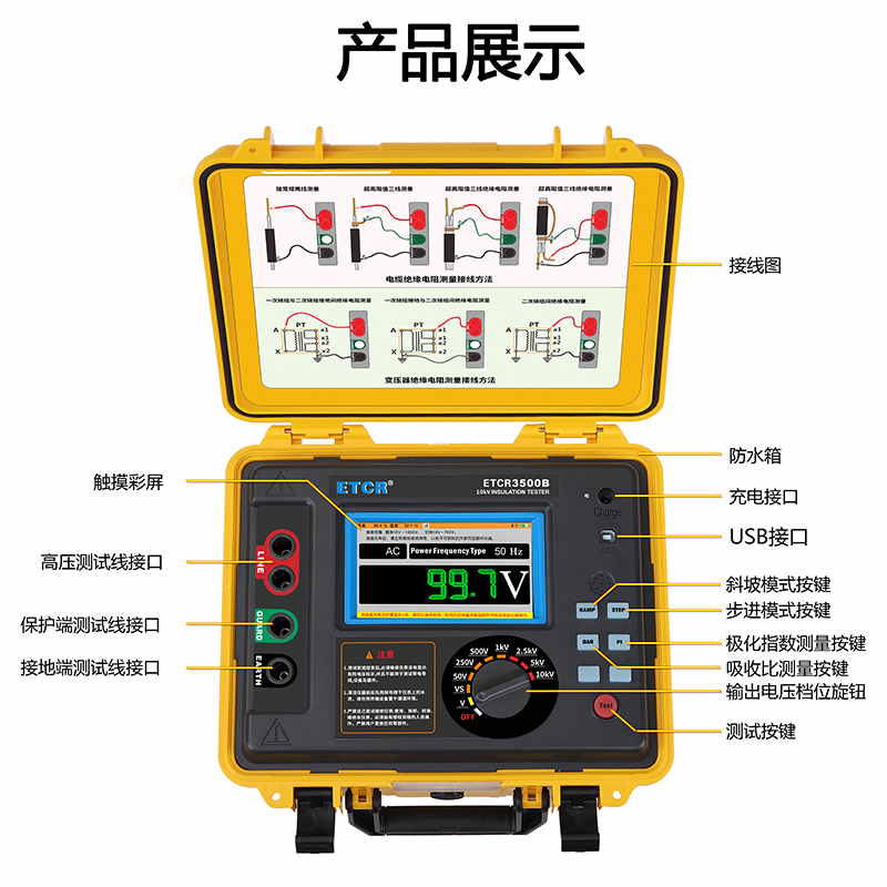 ETCR3500B高壓絕緣電阻測試儀又稱高壓兆歐表、高壓絕緣電阻表,擁有完善的各種絕緣電阻指標測試功能、自設測試電壓功能、良好的抗干擾能力,在變電站等有強感應電環(huán)境下、以及在分布電容較大的使用場景下具有明顯優(yōu)勢。儀表采用真彩觸摸屏,所有測試數(shù)據(jù)及電池電量同屏顯示一目了然,旋鈕開關和按鍵組合使得操作非常簡單。用戶無需費力記憶操作方法,點擊屏幕的“HELP”即可彈出操作方法,有效指引用戶操作儀表。產(chǎn)品適用于大容量、高壓、強感應電環(huán)境下電氣設備、輸電線路等大型設備的絕緣電阻測試。是電力、電信、氣象、機房、油田、機電安裝和維修以及工礦企業(yè)供電部門常用而必不可少的儀表。