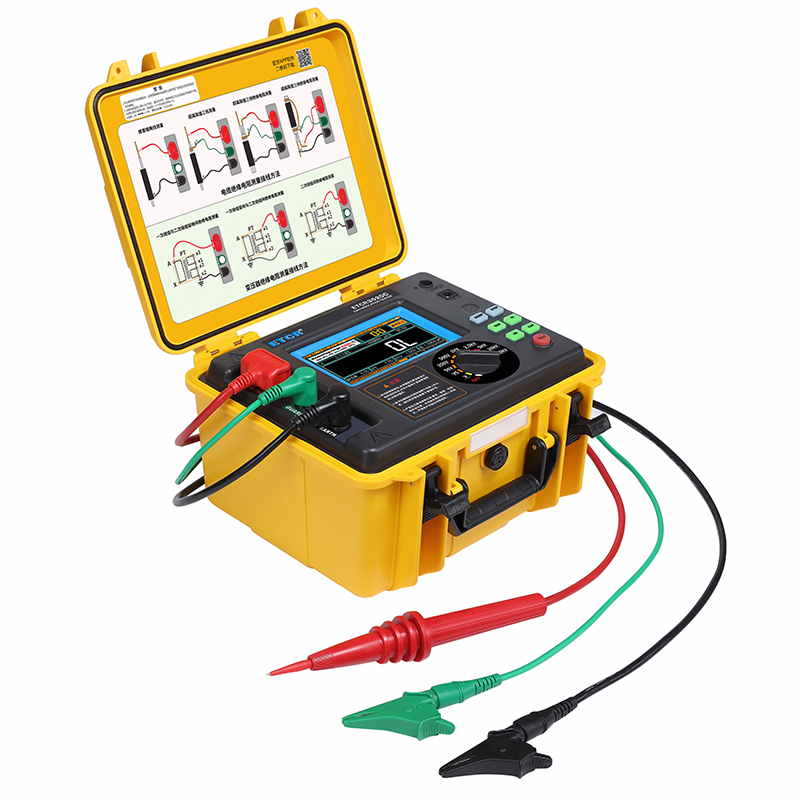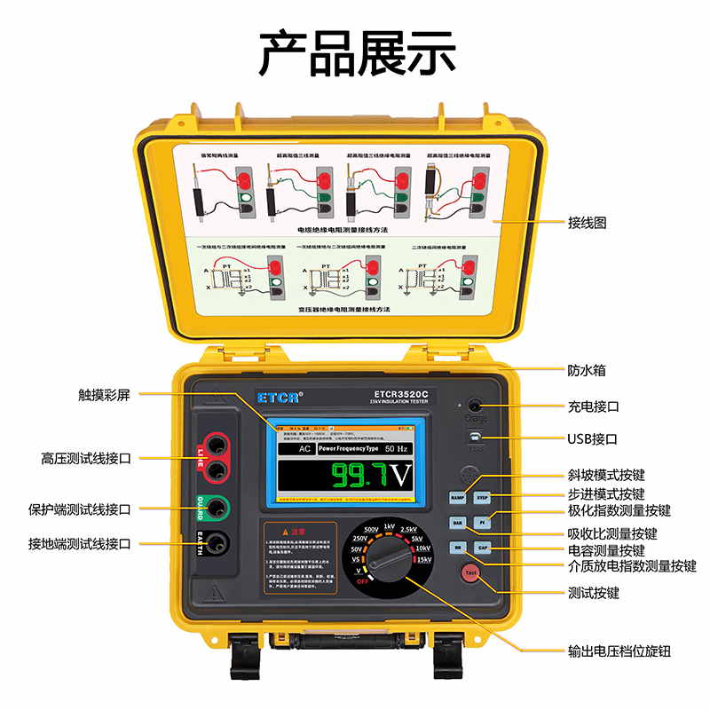 ETCR3520C高壓絕緣電阻測試儀又稱高壓兆歐表、高壓絕緣電阻表,儀表擁有完善的各種絕緣電阻指標測試功能、自設測試電壓功能、良好的抗干擾能力,在變電站等有強感應電環境下、以及在分布電容較大的使用場景下具有明顯優勢。儀表采用真彩觸摸屏,所有測試數據及電池電量同屏顯示一目了然,旋鈕開關和按鍵組合使得操作非常簡單。用戶無需費力記憶操作方法,點擊屏幕的“HELP”即可彈出操作方法,有效指引用戶操作儀表。產品適用于大容量、高壓、強感應電環境下電氣設備、輸電線路等大型設備的絕緣電阻測試。是電力、電信、氣象、機房、油田、機電安裝和維修以及工礦企業供電部門常用而必不可少的儀表。