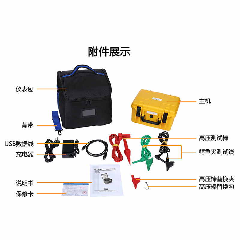 儀表的測試計時器自動記錄測試時間、存儲含有日期時間的測試結果,觸摸屏可以非常方便的查閱記錄的歷史數據,完全隔離的USB接口和藍牙通信可將測試數據安全的上傳到PC機或手機,供用戶進行數據分析。儀表配置帶有雙層絕緣及屏蔽層的測試線,高壓棒配有可更換的鱷魚夾及鉤子,可適應各種測試場所。儀表采用堅固的雙層外殼結構,儀表外箱防護等級IP65,能防止運輸存儲過程中水分灰塵的侵入及防止撞擊有效保護儀表。