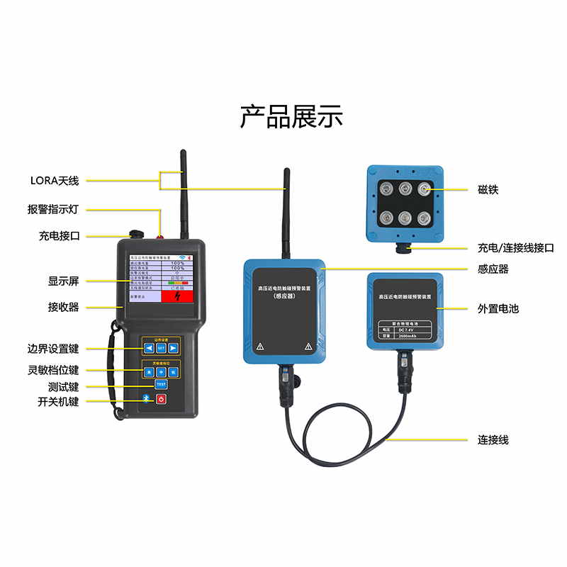 5、聲光報警功能:觸發報警功能時,接收器報警指示燈連續閃爍,蜂鳴器發出“嗶-嗶-嗶”,揚聲器播報語音提示”有電危險,請勿靠近”。