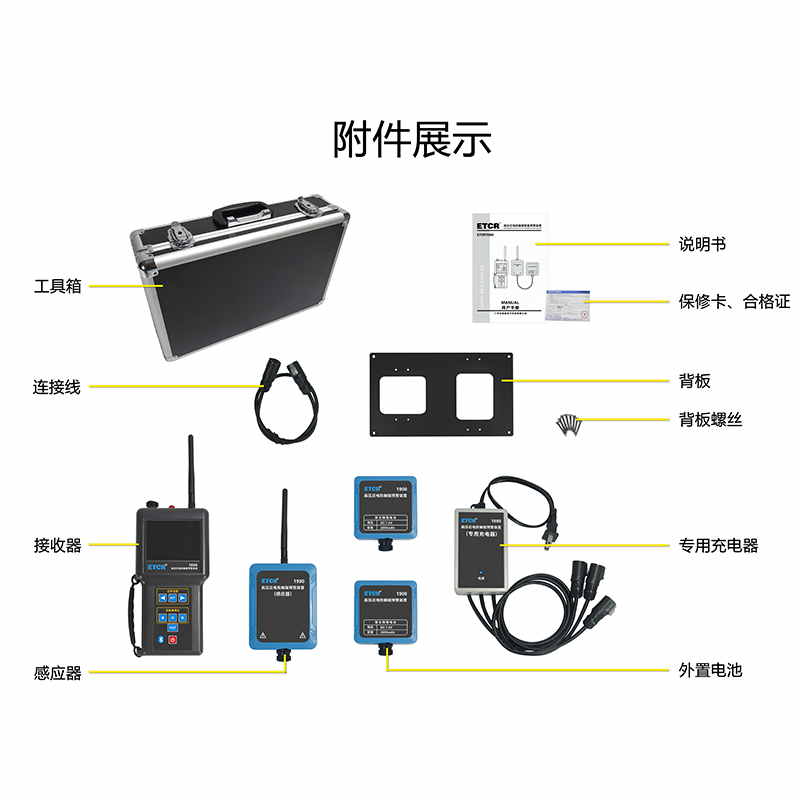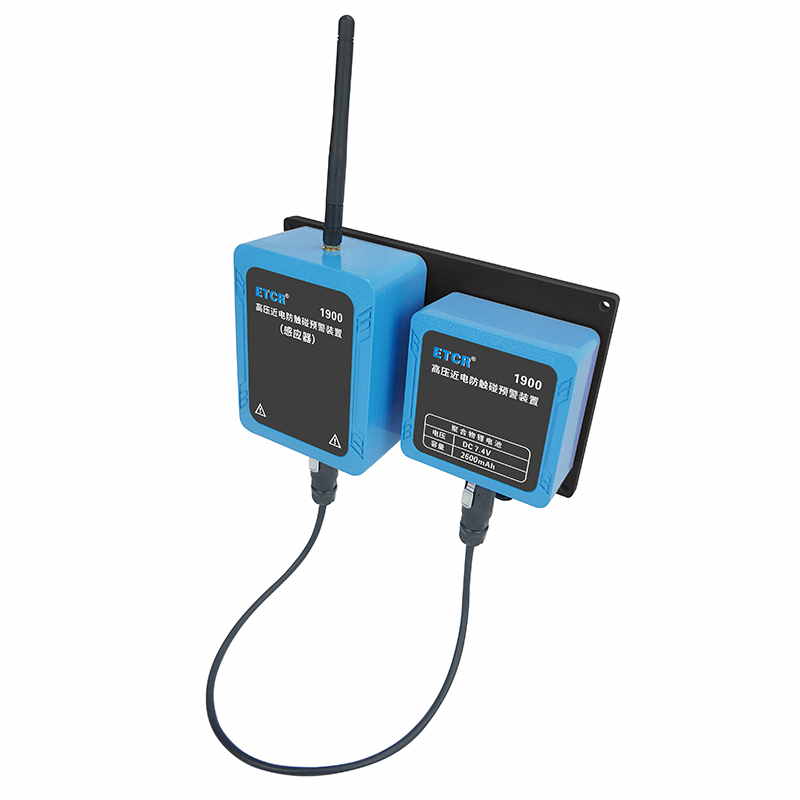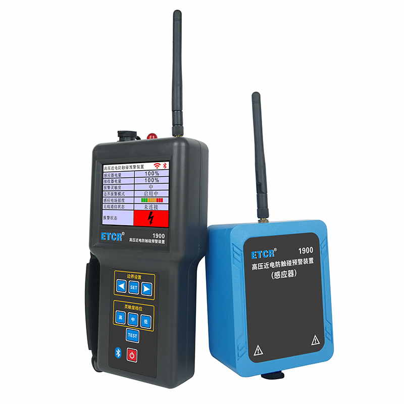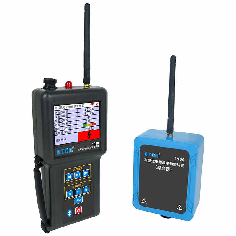 ETCR1900高壓近電防觸碰智能預警裝置由感應器、外置電池、接收器、藍牙APP組成。感應器采用非接觸感應技術用于監測高壓電場,接收器接受感應器發送的監測信號,當電場強度達到設定的報警值時,觸發報警功能發出聲光報警及語音報警。感應器與接收器采用無線通訊,傳輸距離200米。裝置具有報警靈敏度調節和邊界報警功能,用戶可在接收器設置報警靈敏度或自設定報警距離,以適應復雜電場的環境。接收器具有485接口及藍牙功能,便于用戶二次開發。移動終端安裝APP后,可查看報警信號或設置報警參數。