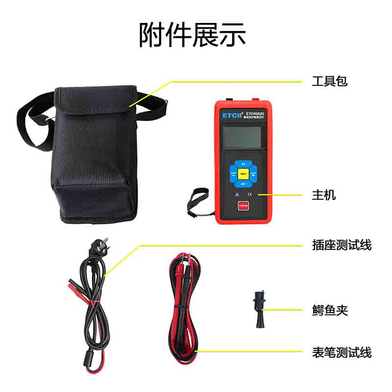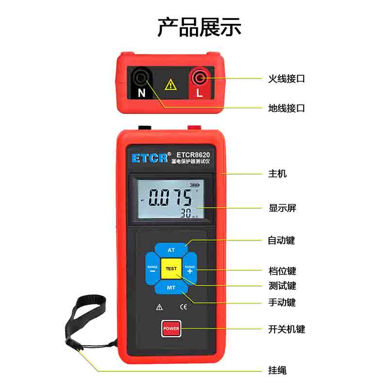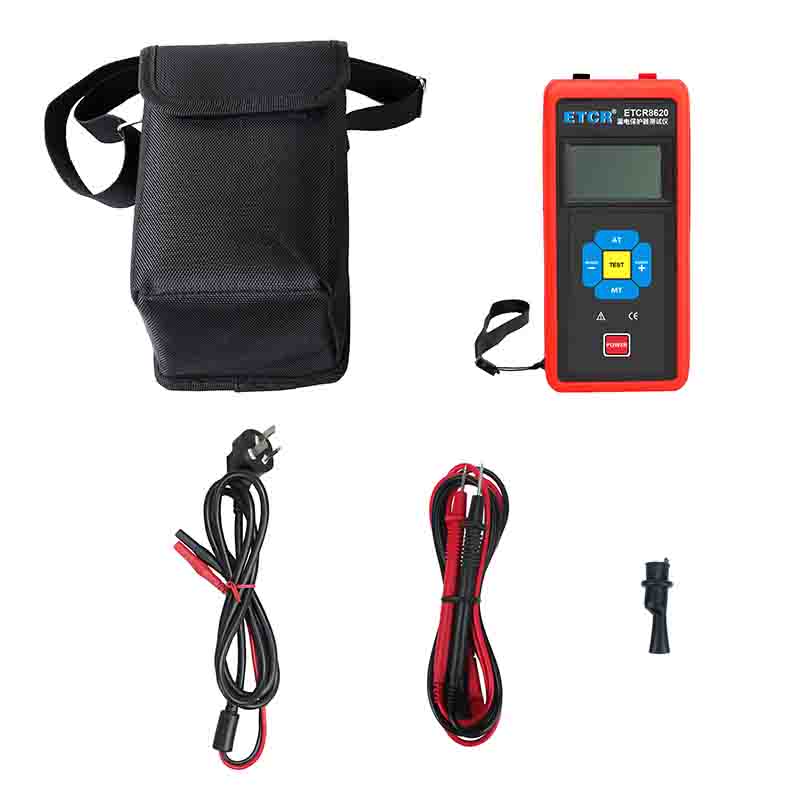 ETCR8620漏電保護(hù)器測(cè)試儀專(zhuān)為現(xiàn)場(chǎng)在線測(cè)試各種漏電保護(hù)器的漏電動(dòng)作時(shí)間,測(cè)試電流從5~1000mA分十二檔(5、15、30、50、75、100、150、200、250、300、500mA、1000mA),測(cè)試漏電流動(dòng)作時(shí)間量程為0.001s~1.000s,采用4位數(shù)值LCD背光顯示,方便直觀。儀表精度高、體積小、重量輕、外觀精致,便于攜帶,是各種漏電保護(hù)器現(xiàn)場(chǎng)或室內(nèi)檢測(cè)的理想工具。