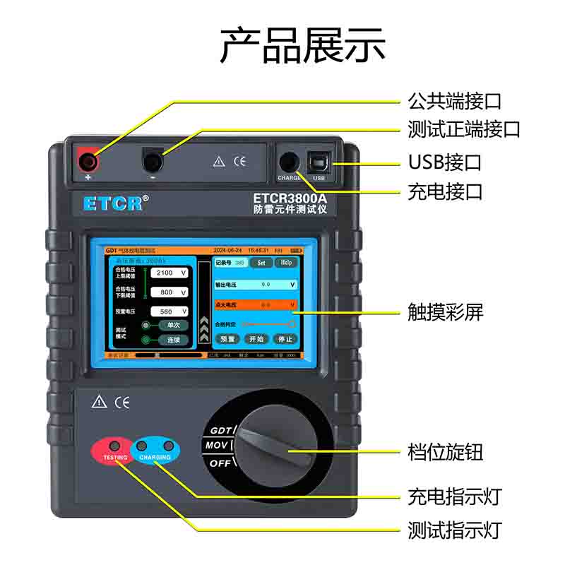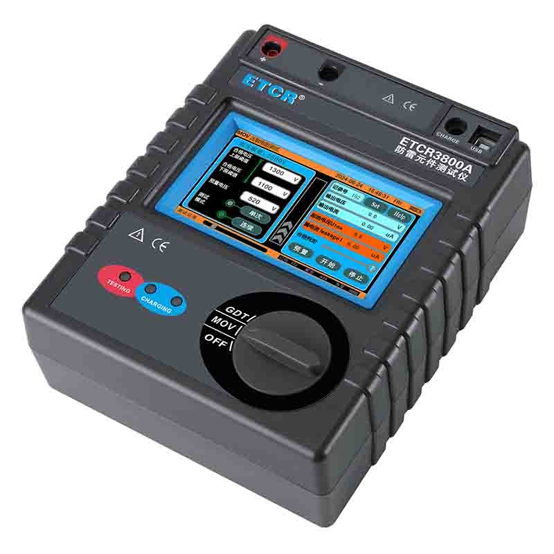 ETCR3800A智能型防雷元件測(cè)試儀又稱防雷元件測(cè)試表、SPD現(xiàn)場(chǎng)測(cè)試儀、壓敏電阻測(cè)試儀、浪涌保護(hù)器測(cè)試儀,用于測(cè)量各種壓敏電阻(MOV)、氣體放電管(GDT)、浪涌保護(hù)器(SPD)性能參數(shù)測(cè)試,儀表具有獨(dú)特的高壓短路保護(hù)、過流保護(hù)功能,專業(yè)級(jí)的參數(shù)設(shè)置功能、高壓限值設(shè)定、升壓速度設(shè)定、合格范圍設(shè)定、合格判斷篩選、自動(dòng)量程調(diào)節(jié)等功能。還具有單件測(cè)試模式、連續(xù)測(cè)試模式功能,特別適合批量元件測(cè)試。儀器廣泛用于避雷器、防雷器、浪涌保護(hù)器、壓敏電阻、金屬陶瓷放電管、真空避雷管等過壓防護(hù)元件性能參數(shù)的測(cè)試。是氣象防雷、電力、通信、機(jī)電安裝和維修、防雷元件生產(chǎn)廠家、以及工業(yè)企業(yè)部門常用必備的儀表。