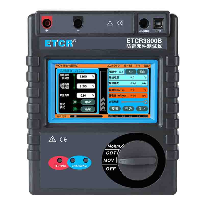 ETCR3800B智能型防雷元件測試儀又稱防雷元件測試表、SPD現(xiàn)場測試儀、壓敏電阻測試儀、浪涌保護(hù)器測試儀,用于測量各種壓敏電阻(MOV)、氣體放電管(GDT)、浪涌保護(hù)器(SPD)性能參數(shù)測試,還具有絕緣電阻、吸收比、極化指數(shù)測試功能。儀表具有獨(dú)特的高壓短路保護(hù)、過流保護(hù)功能,專業(yè)級的參數(shù)設(shè)置功能、高壓限值設(shè)定、升壓速度設(shè)定、合格范圍設(shè)定、合格判斷篩選、自動量程調(diào)節(jié)等功能。還具有單件測試模式、連續(xù)測試模式功能,特別適合批量元件測試。儀器廣泛用于避雷器、防雷器、浪涌保護(hù)器、壓敏電阻、金屬陶瓷放電管、真空避雷管等過壓防護(hù)元件性能參數(shù)的測試。是氣象防雷、電力、通信、機(jī)電安裝和維修、防雷元件生產(chǎn)廠家、以及工業(yè)企業(yè)部門常用必備的儀表。