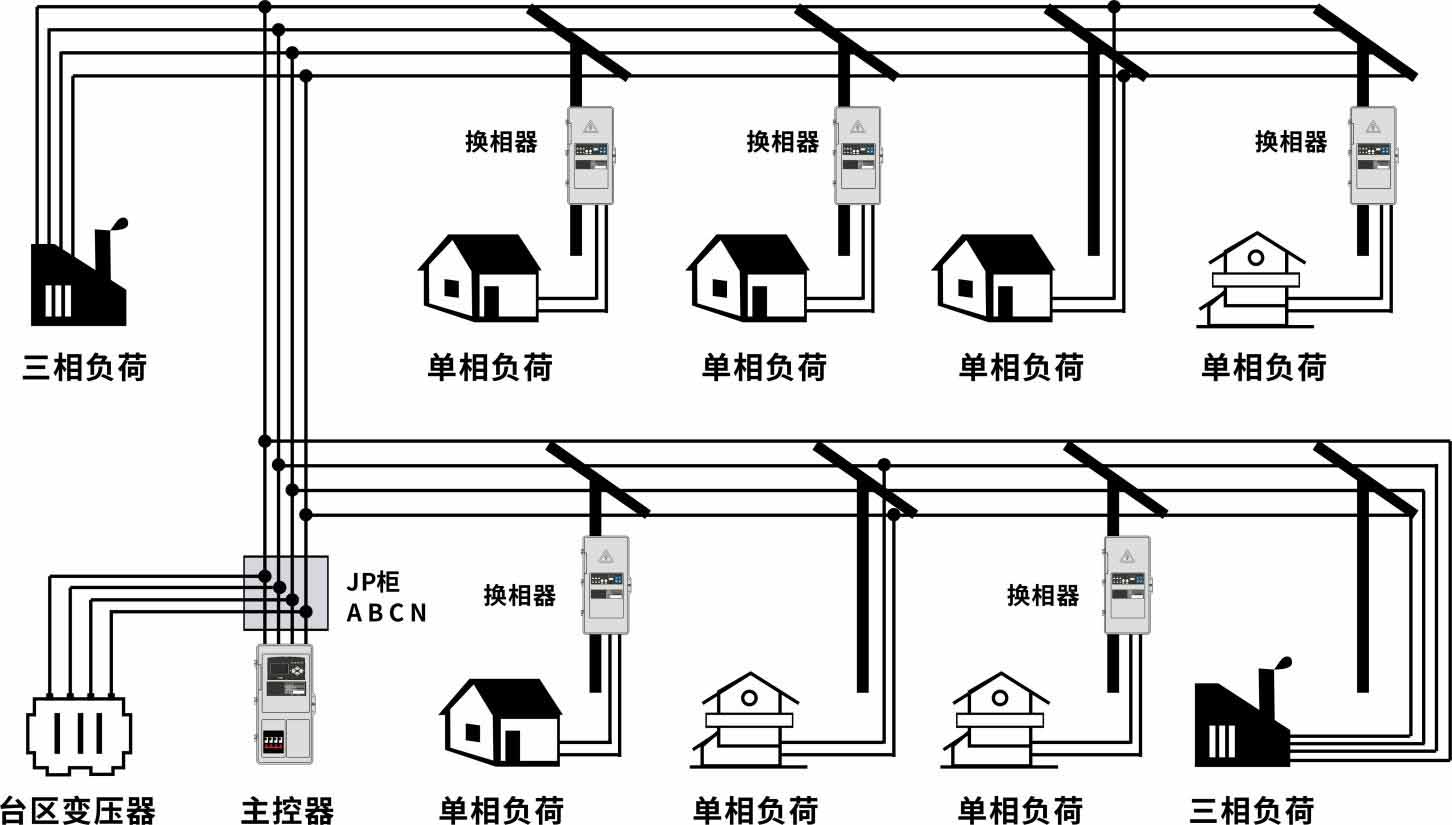 治理一個臺區(qū)需根據(jù)臺區(qū)變壓器容量及不平衡的嚴重程度,配置一臺主控器及若干臺換相開關。換相開關接收主控器發(fā)出的指令將單相負荷在三相之間切換,切換過程不中斷供電,不會影響用戶用電。從而有效解決配網(wǎng)中三相負荷不平衡問題。