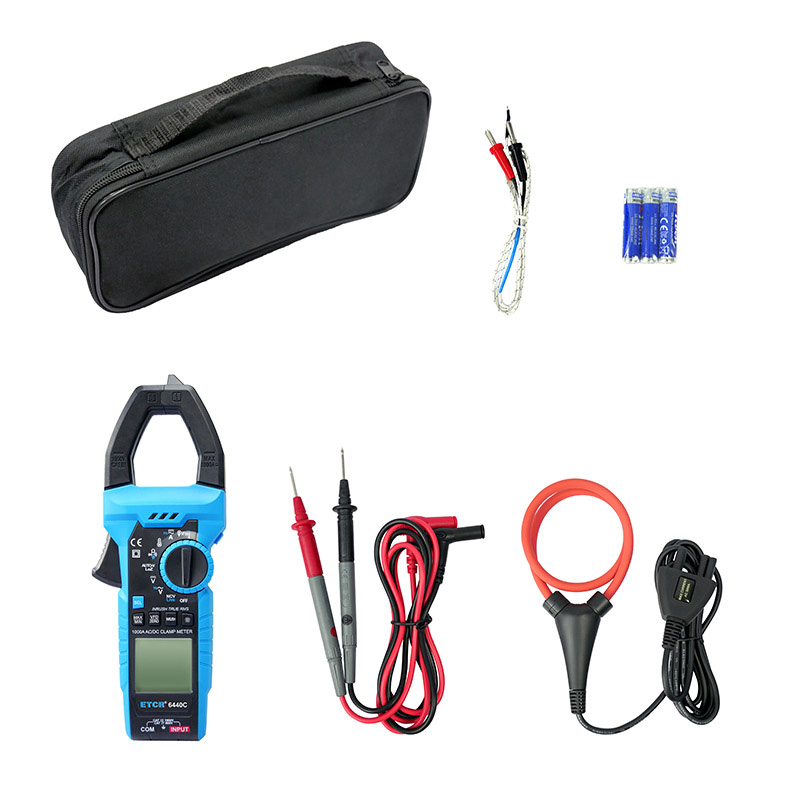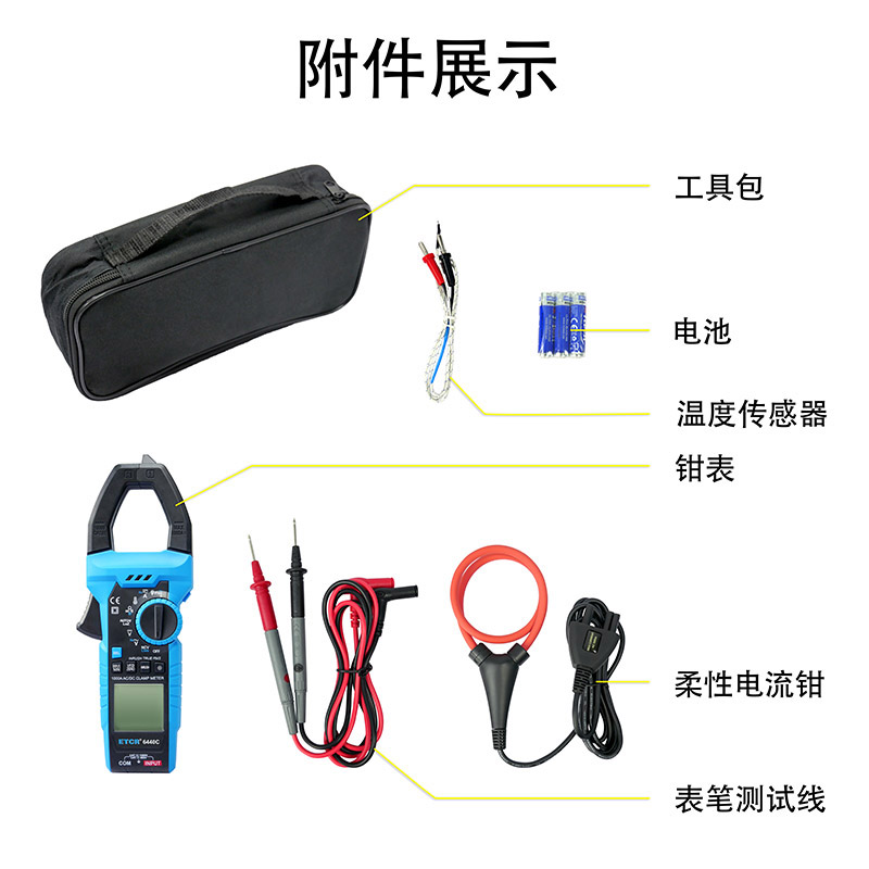 隨機附件 | 鉗表:1件;表筆:1套;溫度傳感器:1件;1.5V電池:3節(jié);工具包:1件 |