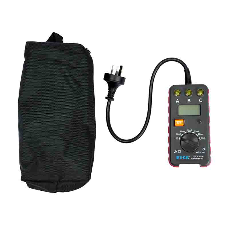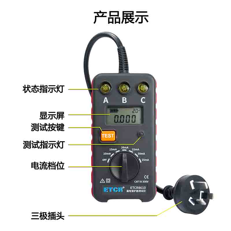 ETCR8610插座式漏電保護器測試儀專為現場檢查三極插座工作狀態同時測試漏電保護器的漏電動作時間,測試電流從10~35mA分6檔(10mA、15mA、20mA、25mA、30mA、35mA),測試漏電流動作時間量程為0.001s~1.000s。測試時,將儀表的三極插頭插入三極插座。儀表的指示燈A、B、C顯示插座工作狀態及接線是否正確,測試漏電流動作時間。儀表便攜式設計,體積小、重量輕、外觀精致,便于攜帶,是各種漏電保護器現場或室內檢測的理想工具。