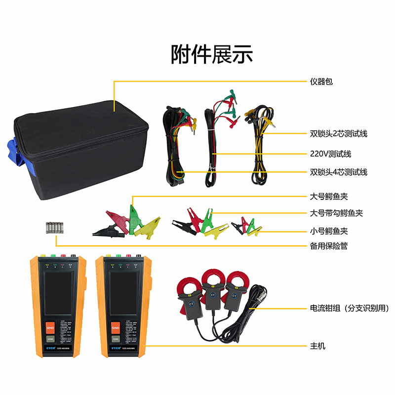 從機測試線 | 雙鎖頭2芯測試線(黃、黑)、220V測試線(紅、黑) |