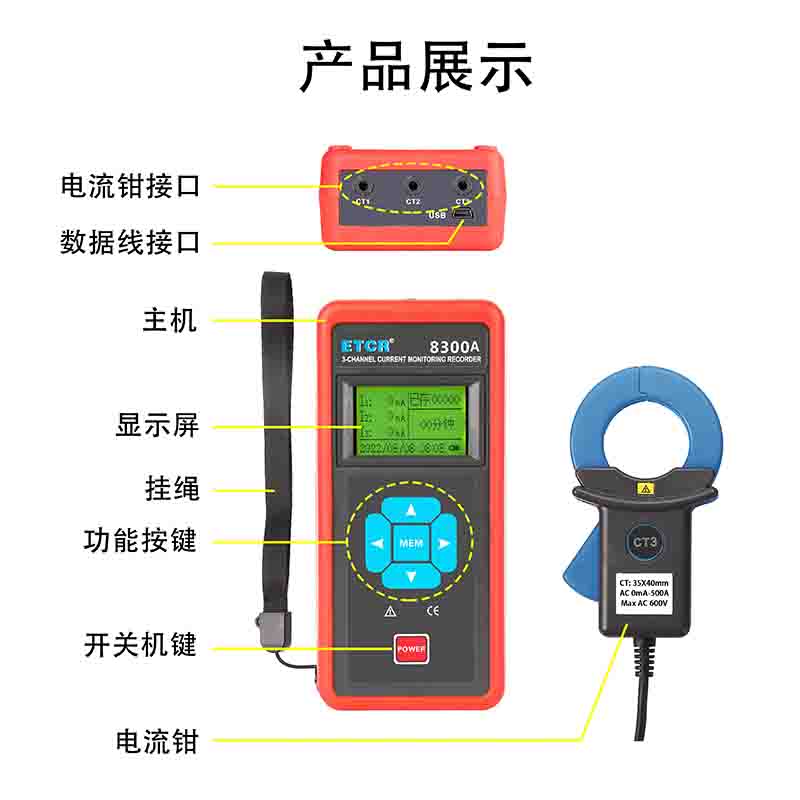 ETCR8300A三路鉗形電流記錄儀 | 35mm×40mm | AC 0mA~500A | 7天 | 1秒-99分鐘 | 20萬組 | 鋰電池 | 有 | |
