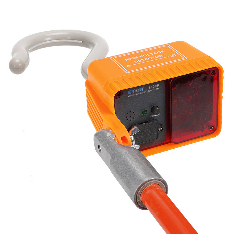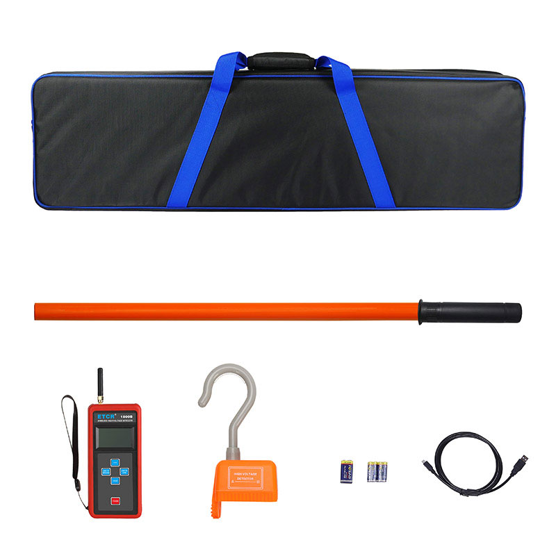 ETCR1800B無線高壓驗電器由接收器、探測器、伸縮絕緣桿、數據上傳軟件、USB通訊線等組成,測試時只需用絕緣桿把探測器掛在裸導線上,通過無線信號傳輸即可在手持接收器上讀取電壓值及電流值,一目了然非常直觀,操作非常方便。無線信號直線傳輸距離約30米,探測器有紅色LED和蜂鳴器等聲光報警,使測試更簡單輕松。通過USB通訊接口和上位機軟件存儲數據上傳電腦具有歷史數據查詢、保存、打印等功能。