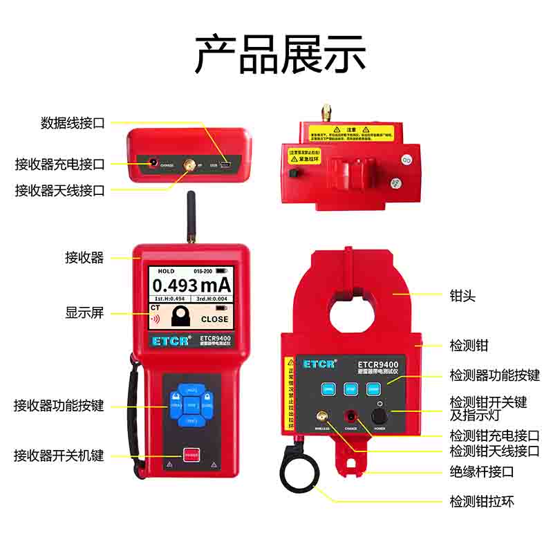 ETCR9400氧化鋅避雷器鉗形帶電測試儀由主機、檢測儀、絕緣桿組成。主機與檢測儀采用無線通訊,通訊距離30米,主機可遙控檢測儀鉗頭的張開或閉合完成測試過程,主機能實時顯示電流測試值及鉗頭狀況。檢測儀采用微型馬達驅動鉗頭的張開或閉合,鉗頭采用高性能坡莫合金制作,具有超強的抗干擾能力,幾乎不受外部磁場的影響,分辨率高達1uA。檢測儀可連接絕緣桿用于高壓線路的氧化鋅避雷器測試。儀表也可做超高精度鉗形漏電流表使用。儀表還具有數據保持、數據存儲功能,配有USB接口,存儲數據可上傳電腦。
